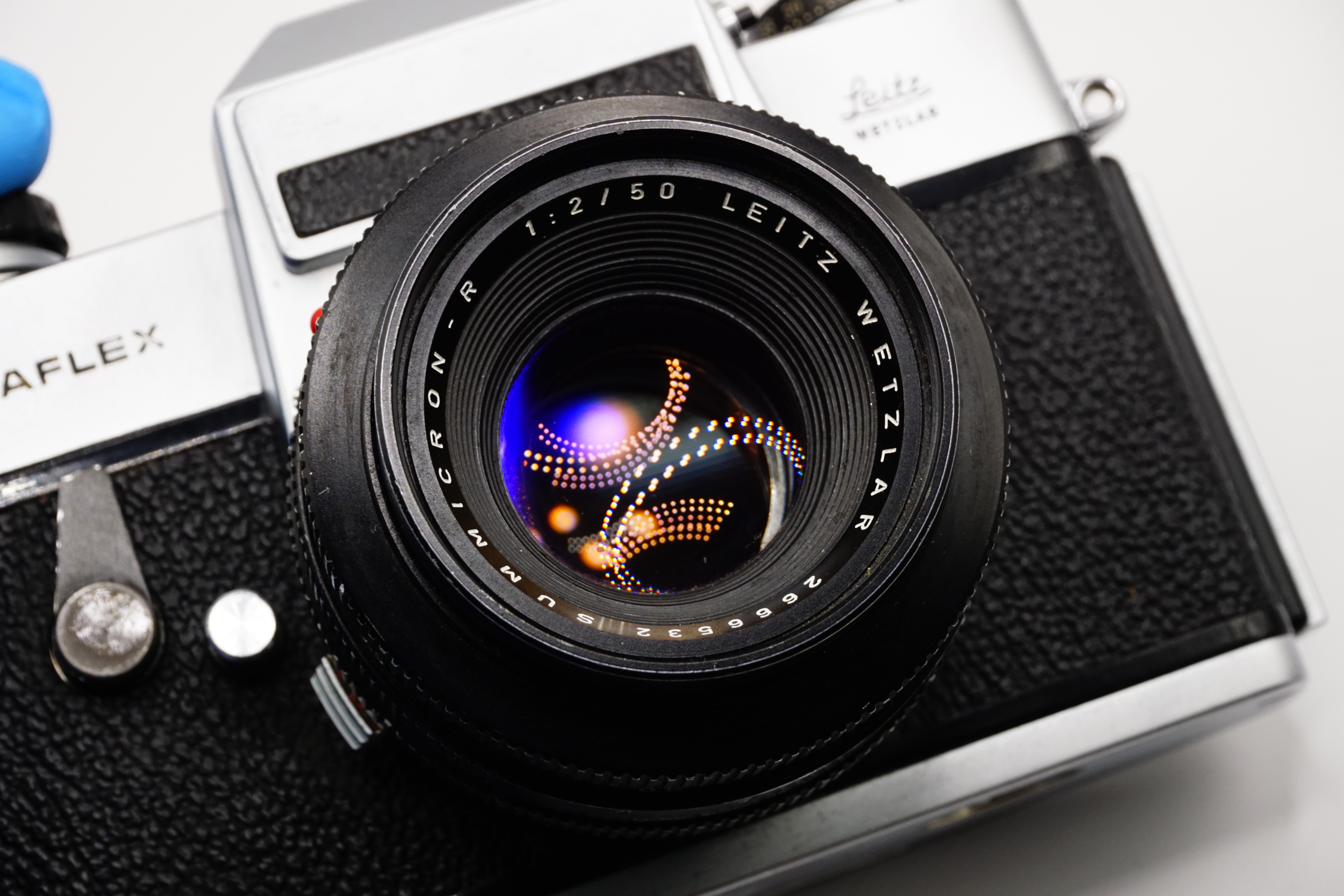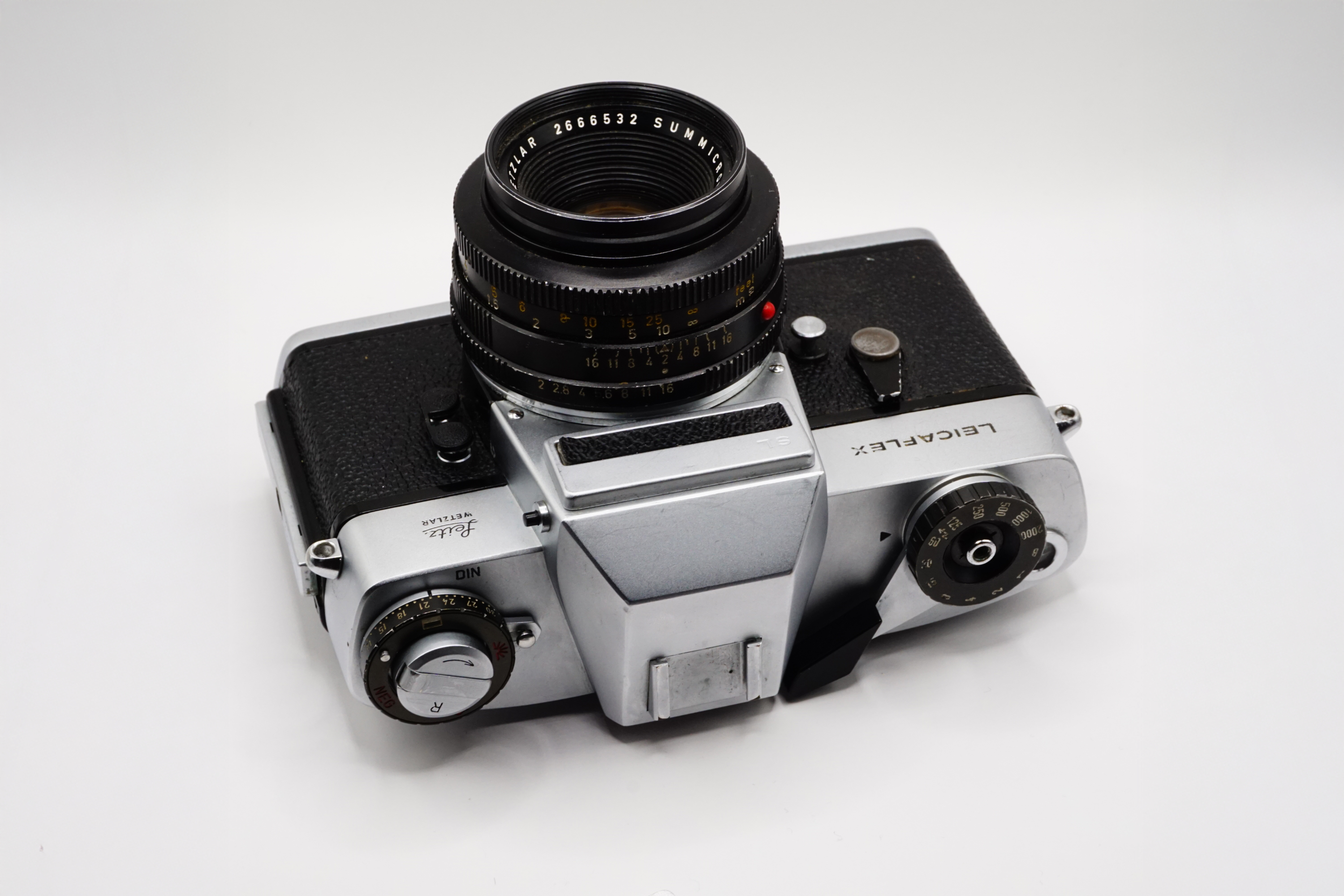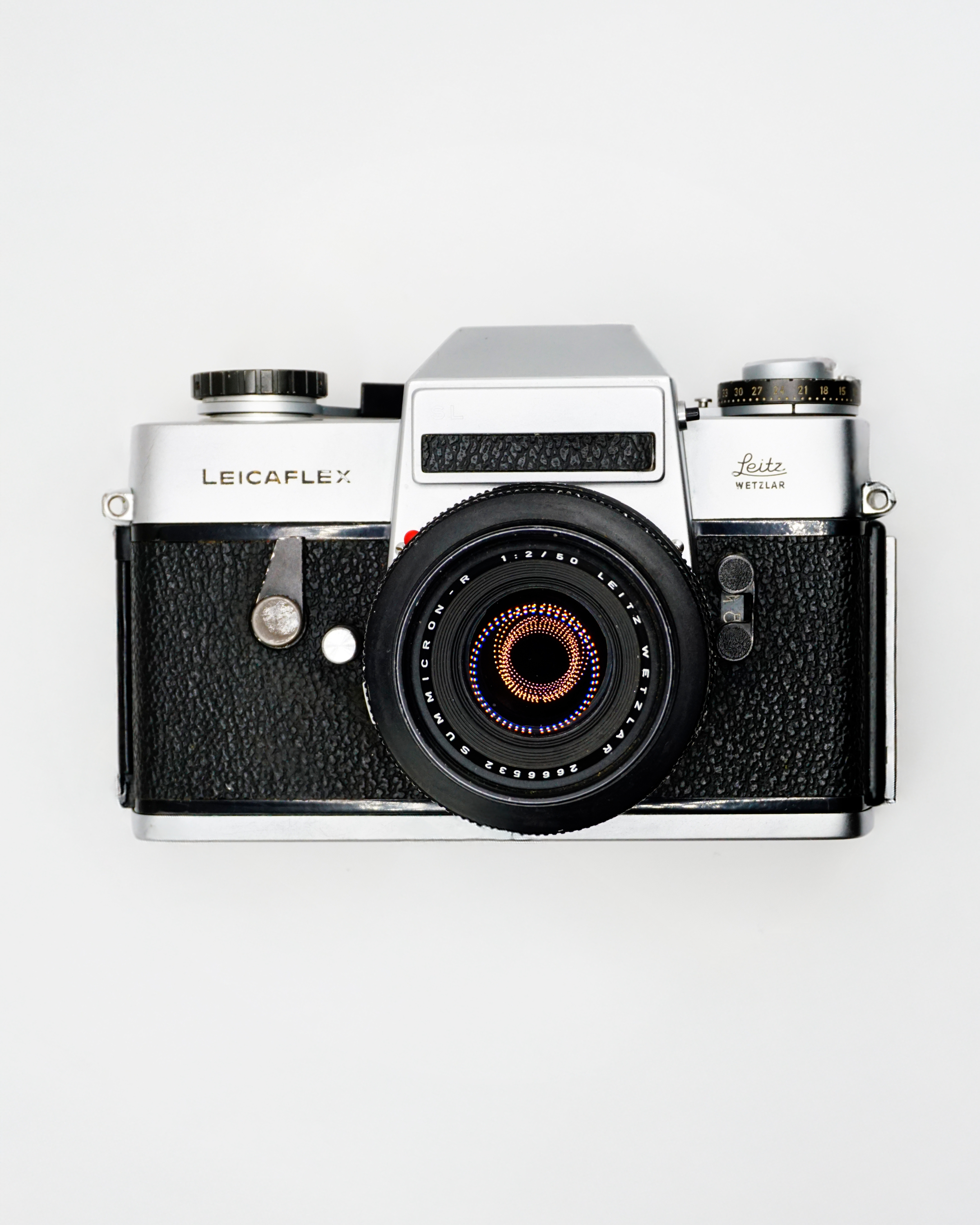 SL 35 mm SLR film camera paired with a Leitz Wetzlar Summicron-R 50 mm f/2 standard lens — a premium German-made camera system from the late 1960s/early 1970s. The Leicaflex SL is a fully mechanical single-lens-reflex camera with TTL selective through-the-lens metering, manual exposure control, and shutter speeds up to 1/2000 s. Built to exacting standards by Ernst Leitz Wetzlar, Germany, it’s known for its robust metal construction, bright viewfinder with microprism focusing aid, and satisfying tactile controls.
