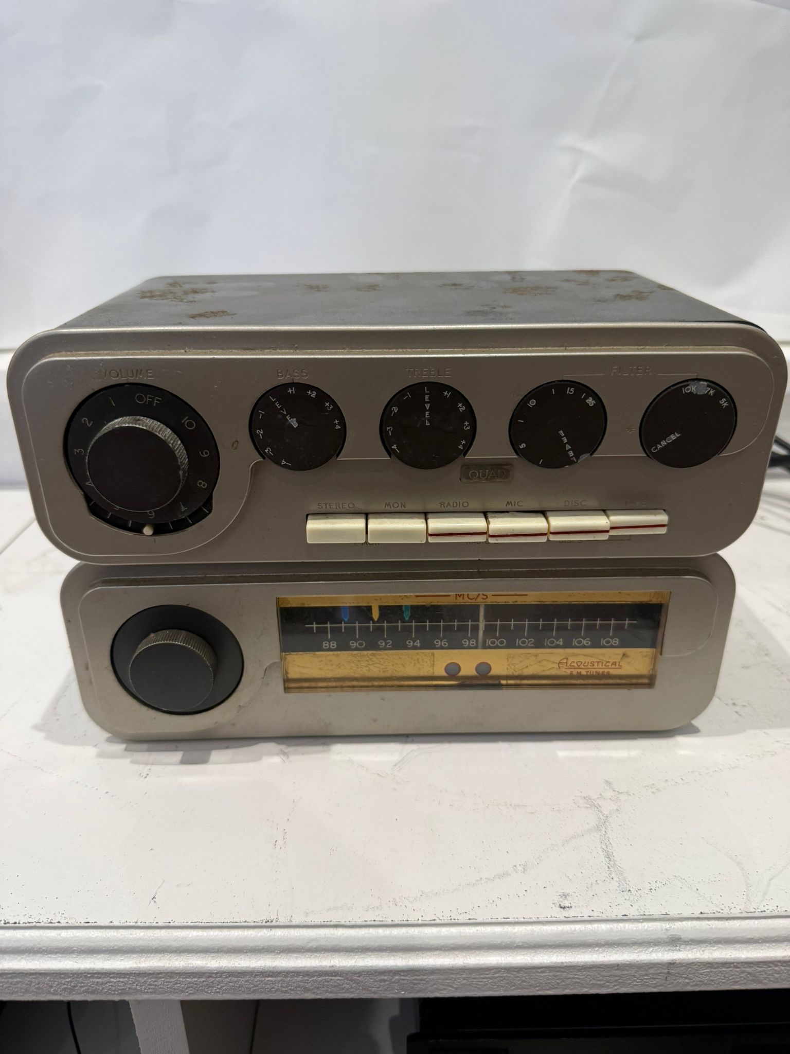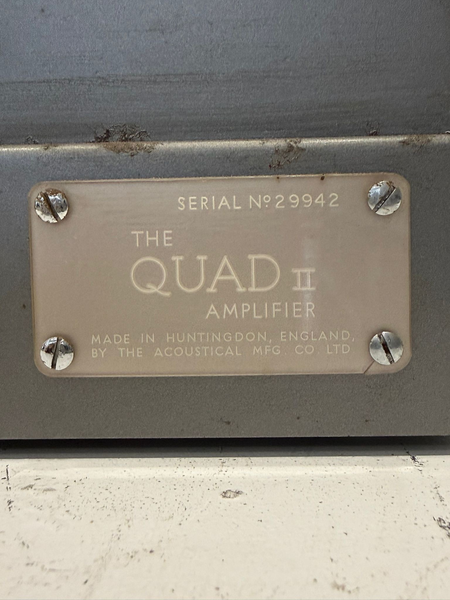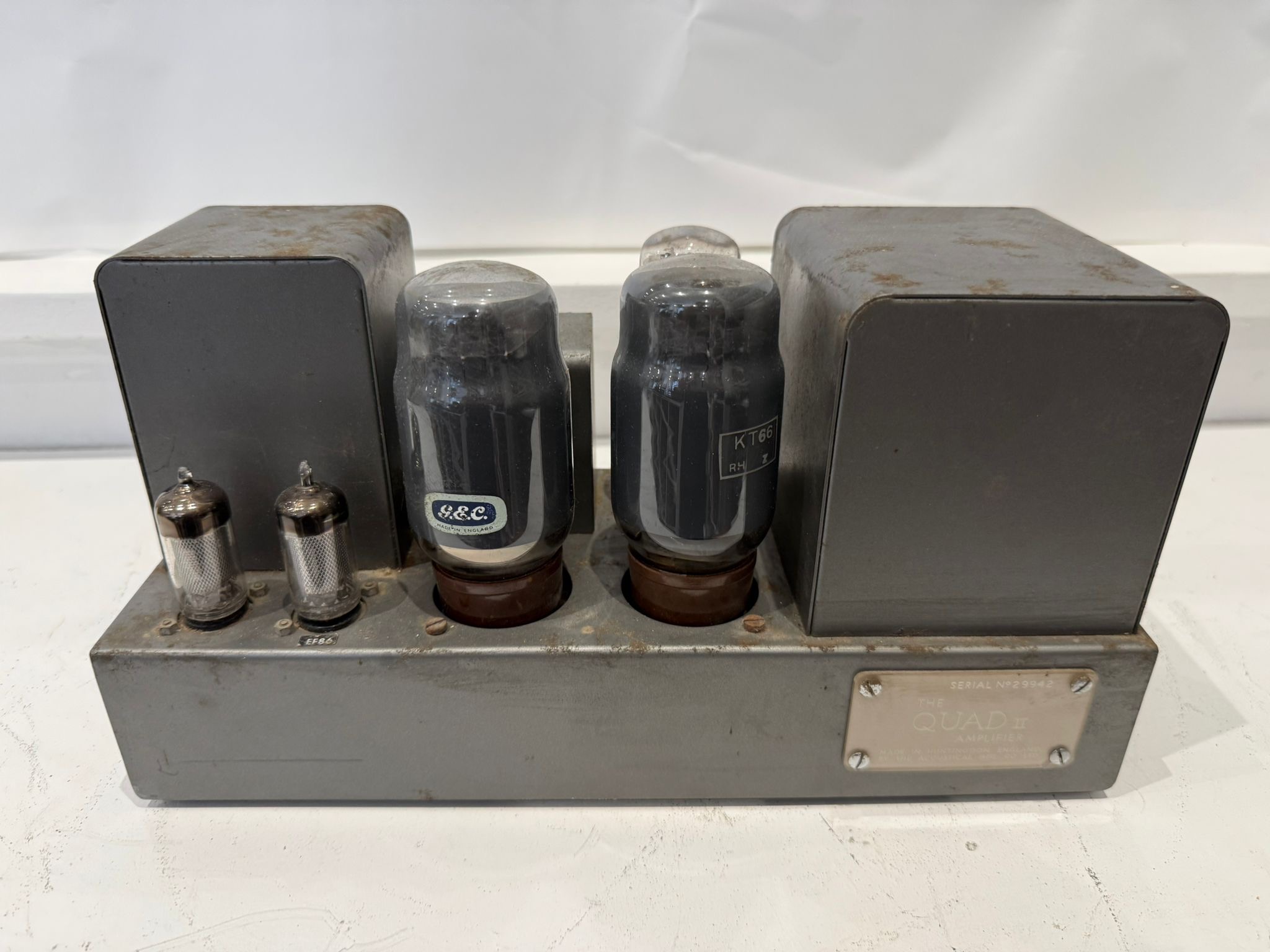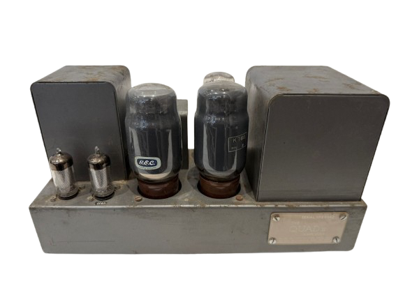 A highly collectible early QUAD valve hi-fi system, manufactured in Huntingdon, England during the 1950s–early 1960s, comprising the legendary Quad II power amplifier(s), FM2 valve FM tuner, and Quad 22 control unit.