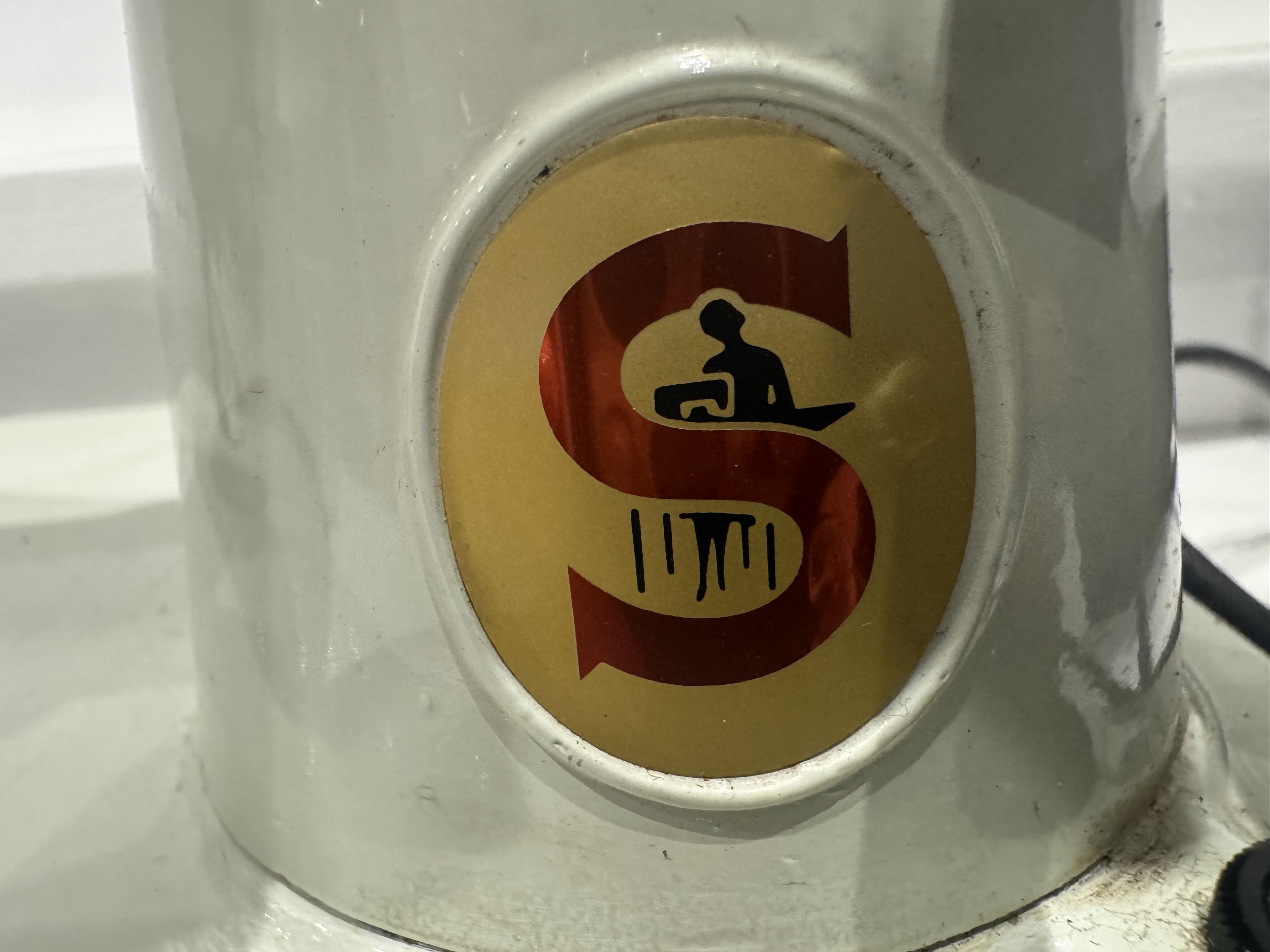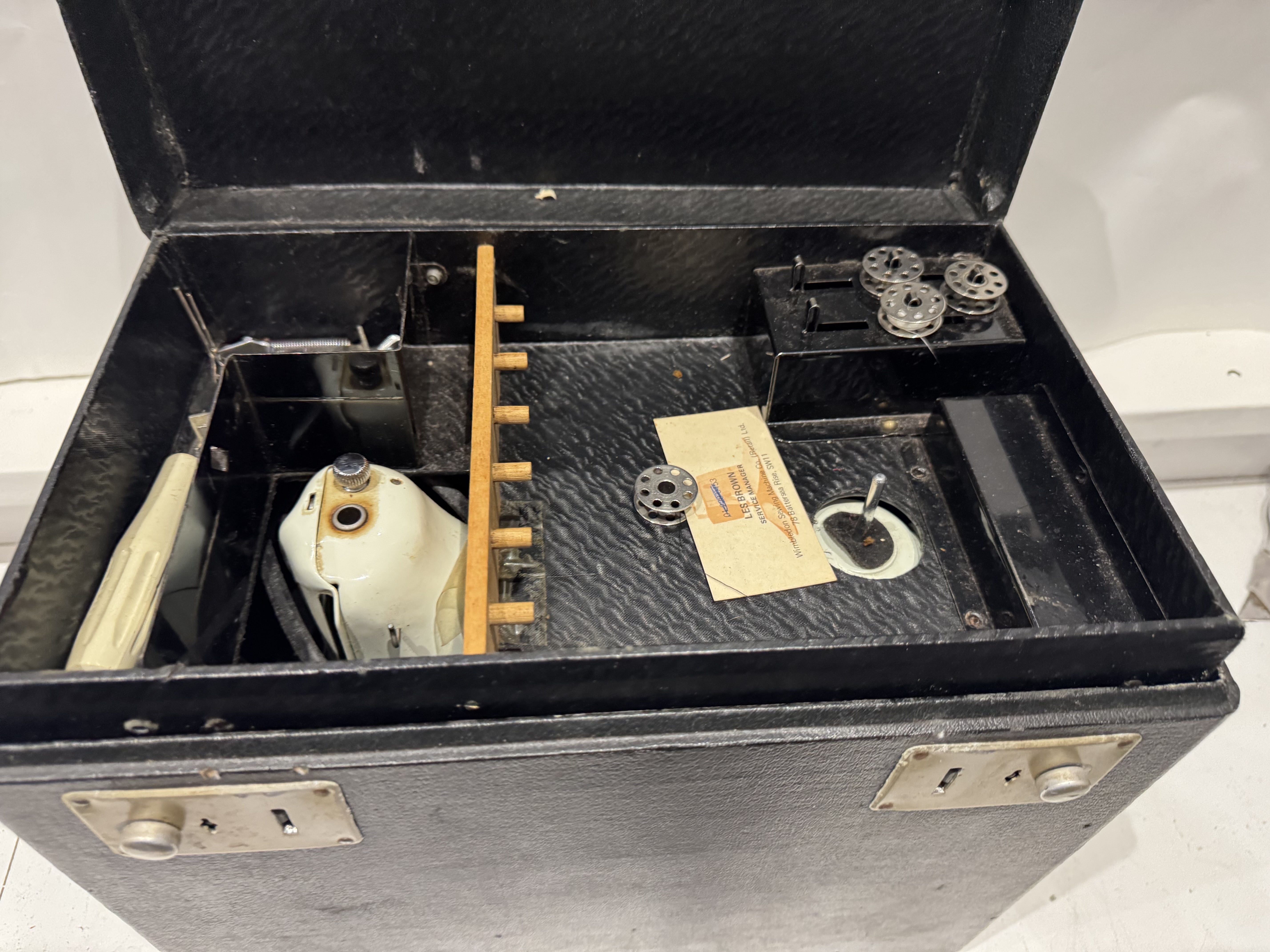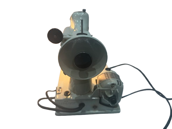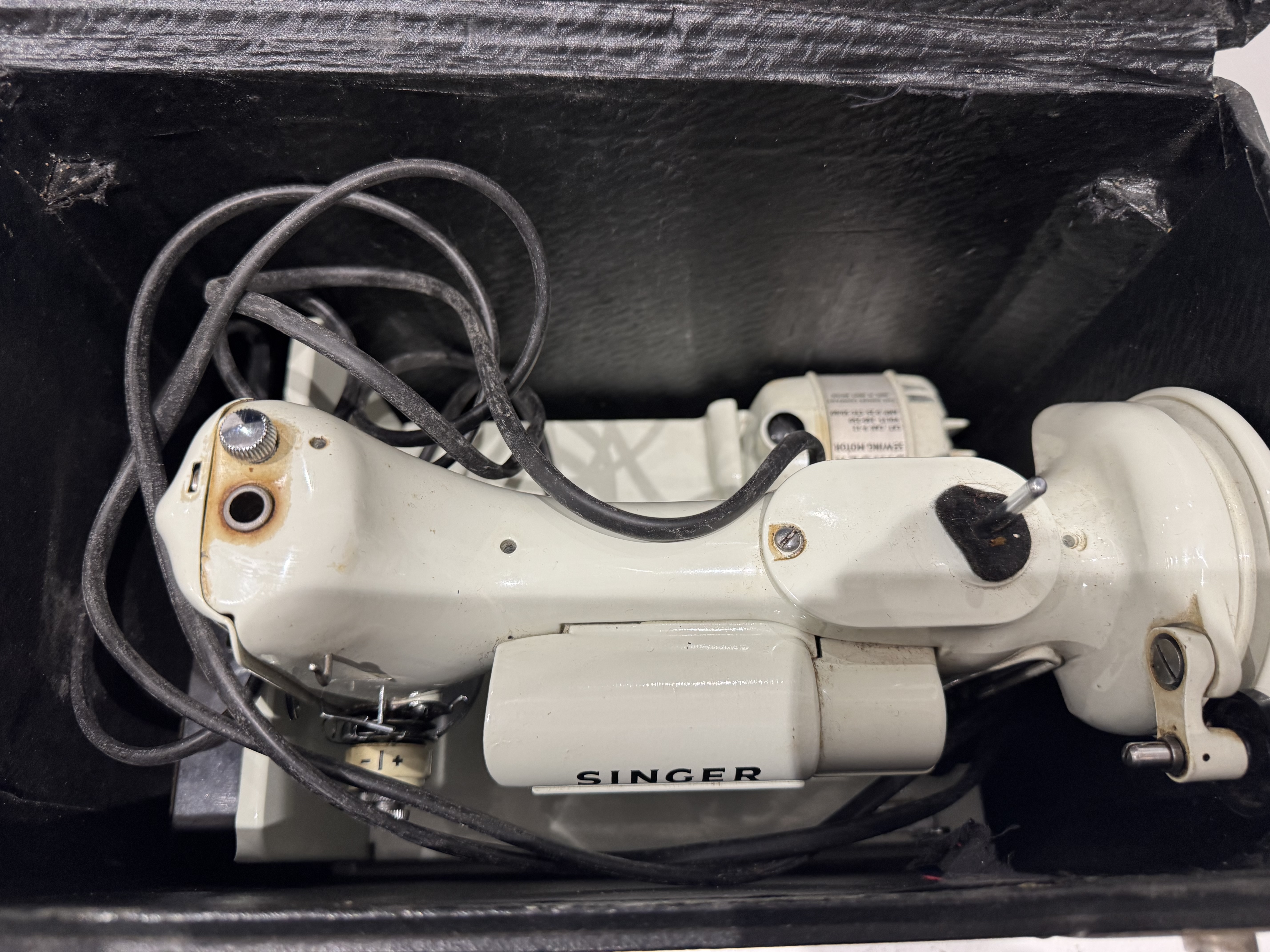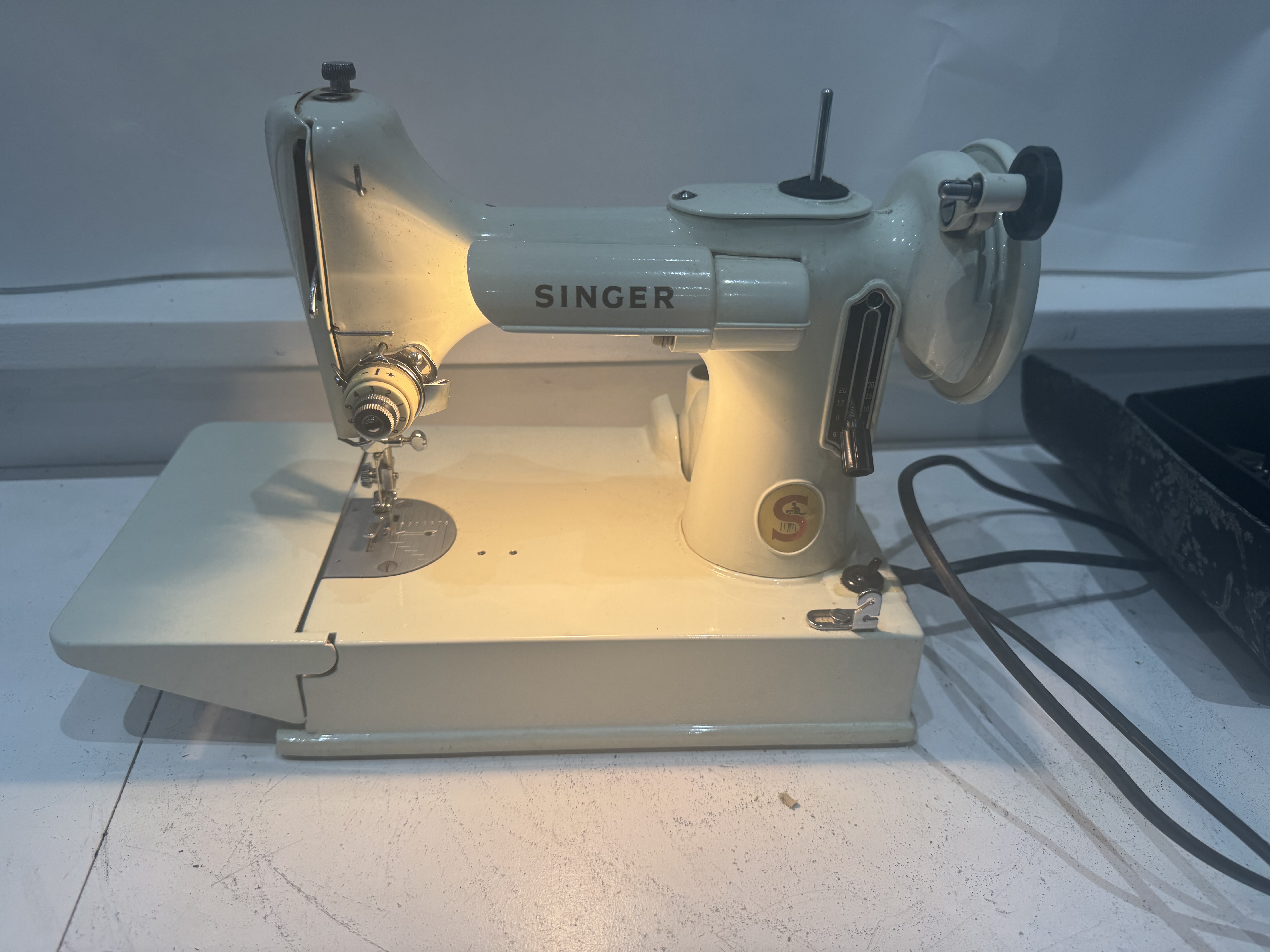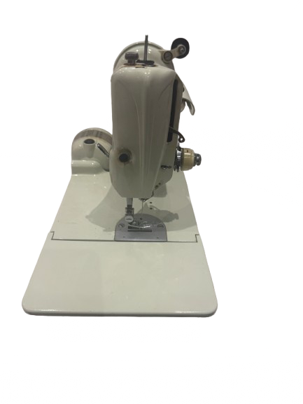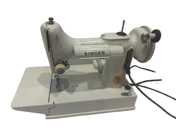 A solid, vintage Singer electric sewing machine, finished in the classic white enamel with chrome detailing. Built by Singer, these machines are renowned for their durability, smooth stitching, and long service life. 240v with case keys foot control