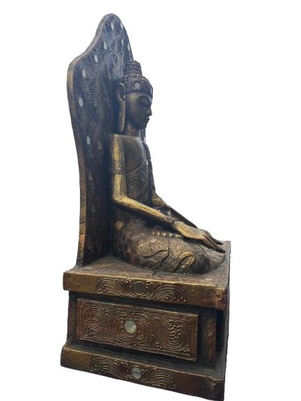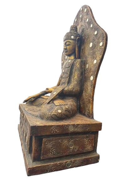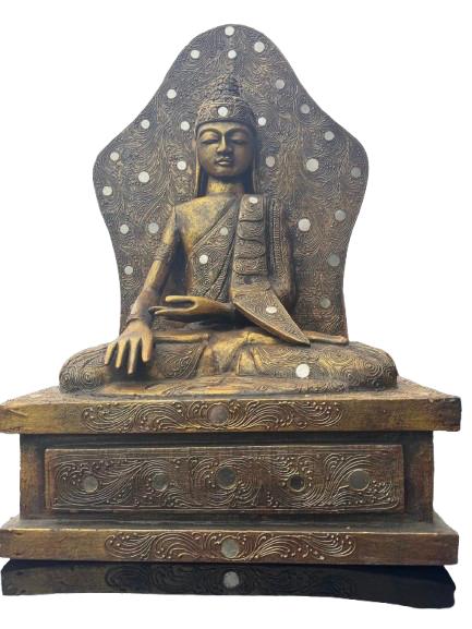 A finely carved wooden Buddha statue seated in a meditative pose, mounted on an integral tiered rectangular plinth. The figure is backed by a decorative aureole panel, richly detailed with carved motifs and inset circular accents, giving the piece strong visual presence and balance. The surface shows a warm, aged patina that enhances the depth of the carving and highlights the craftsmanship.