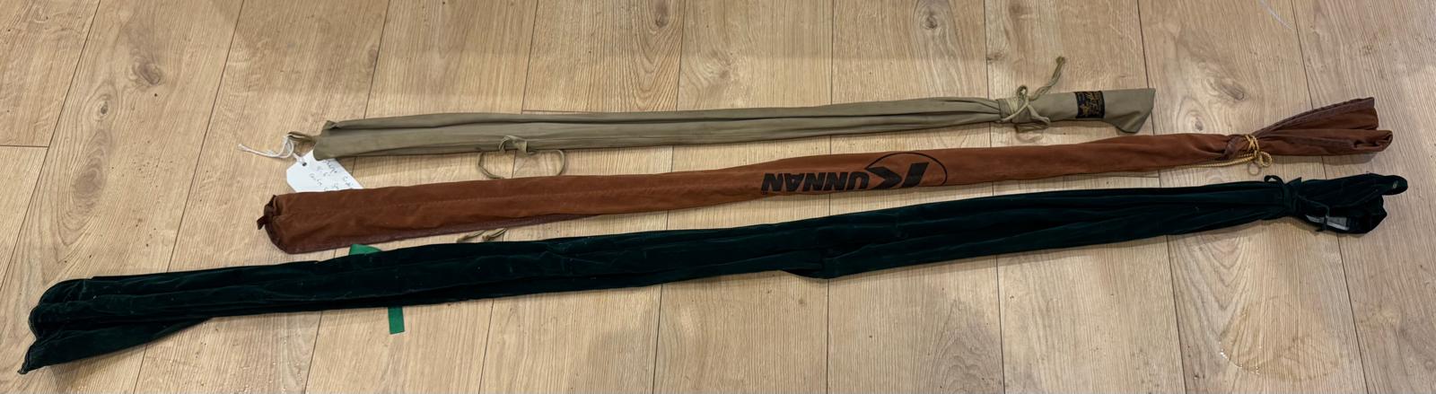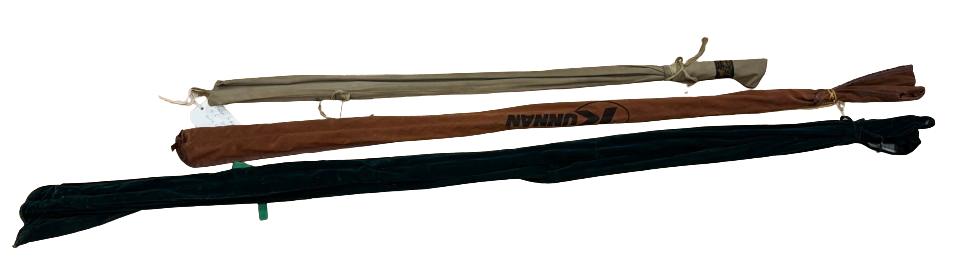 A small collection of fishing rod bags and protective sleeves, including j s sharp dunlop sport 3.3 kunnan rods