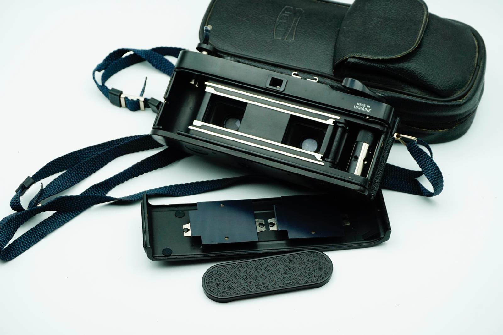 with dual Industar-81 38mm f/2.8 lenses, body G-VG, shutter working, some minor dust on lens, with front lens cap.