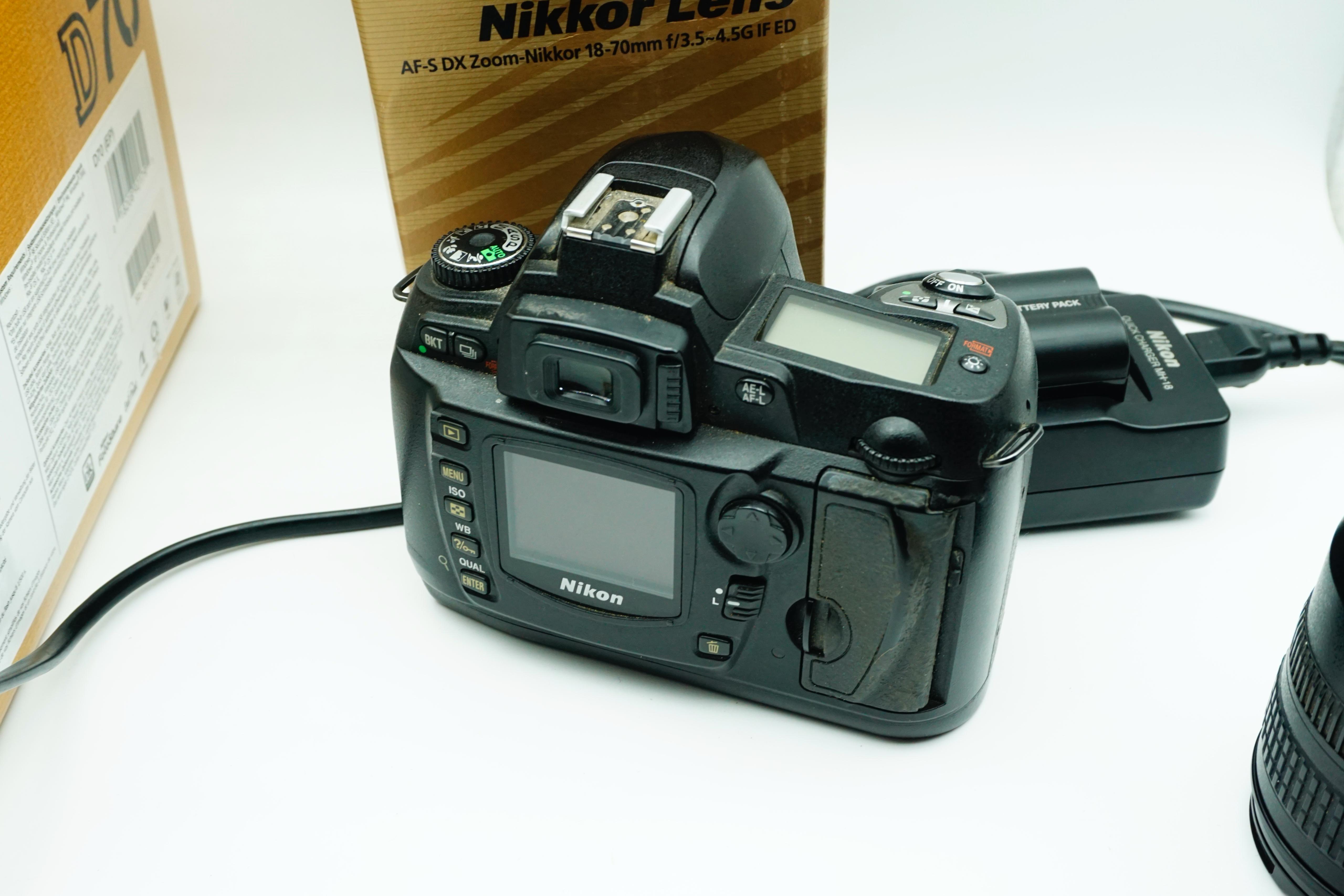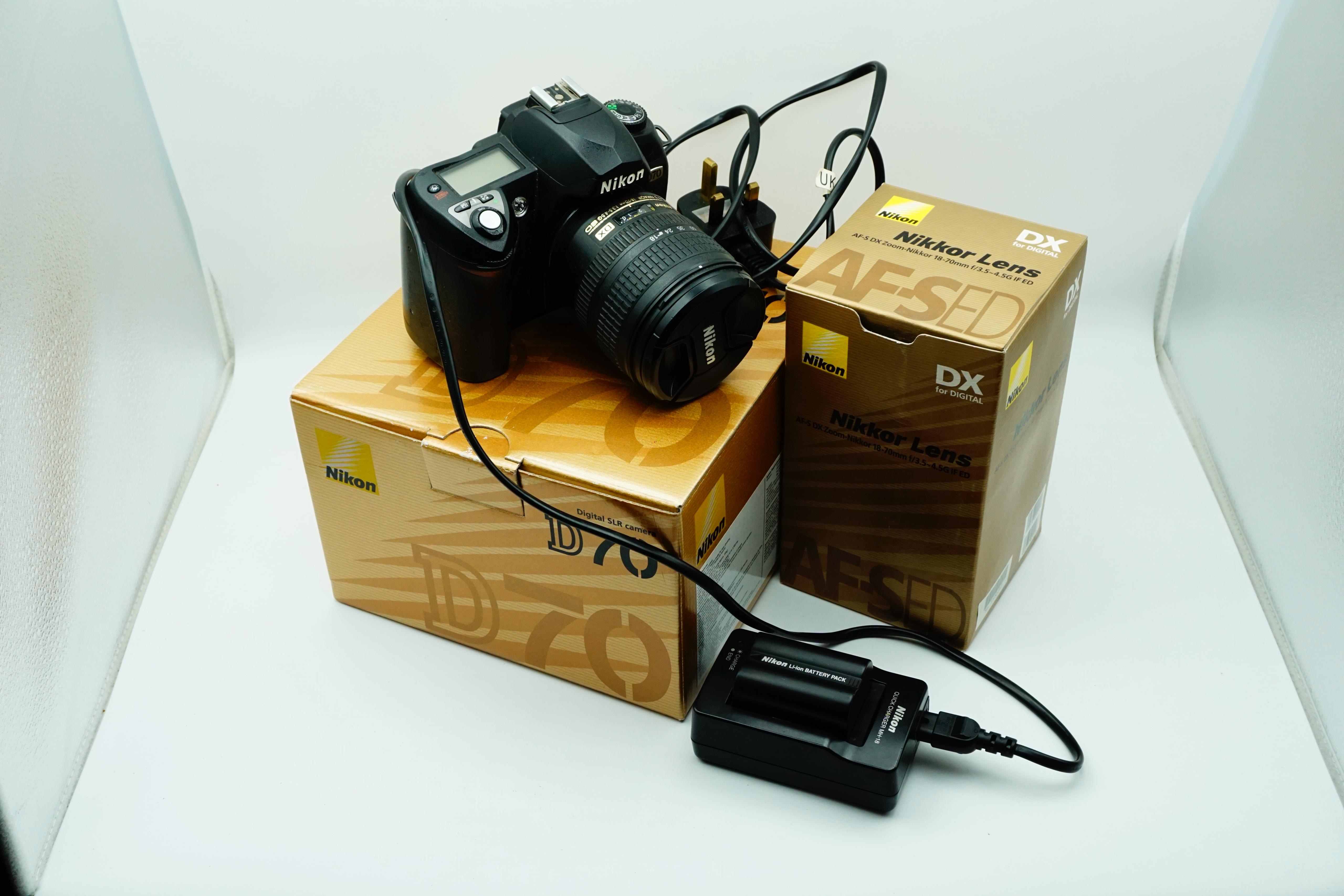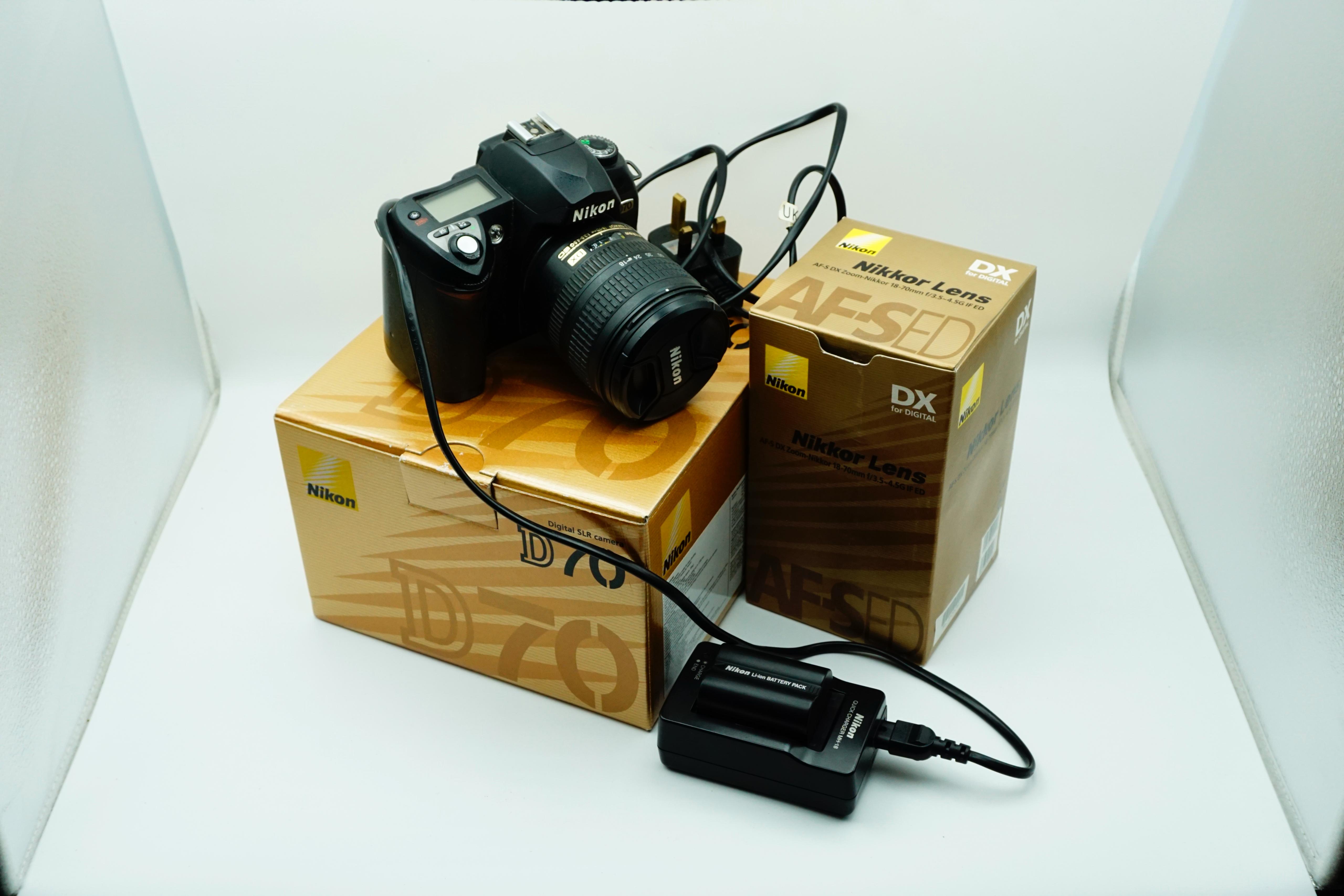 paired with the versatile AF-S DX Zoom-Nikkor 18–70mm f/3.5–4.5G IF-ED lens. The D70 is a landmark Nikon DSLR, well known for its robust build, excellent image quality, and intuitive controls, making it a great choice for beginners, enthusiasts, or collectors of early digital cameras.